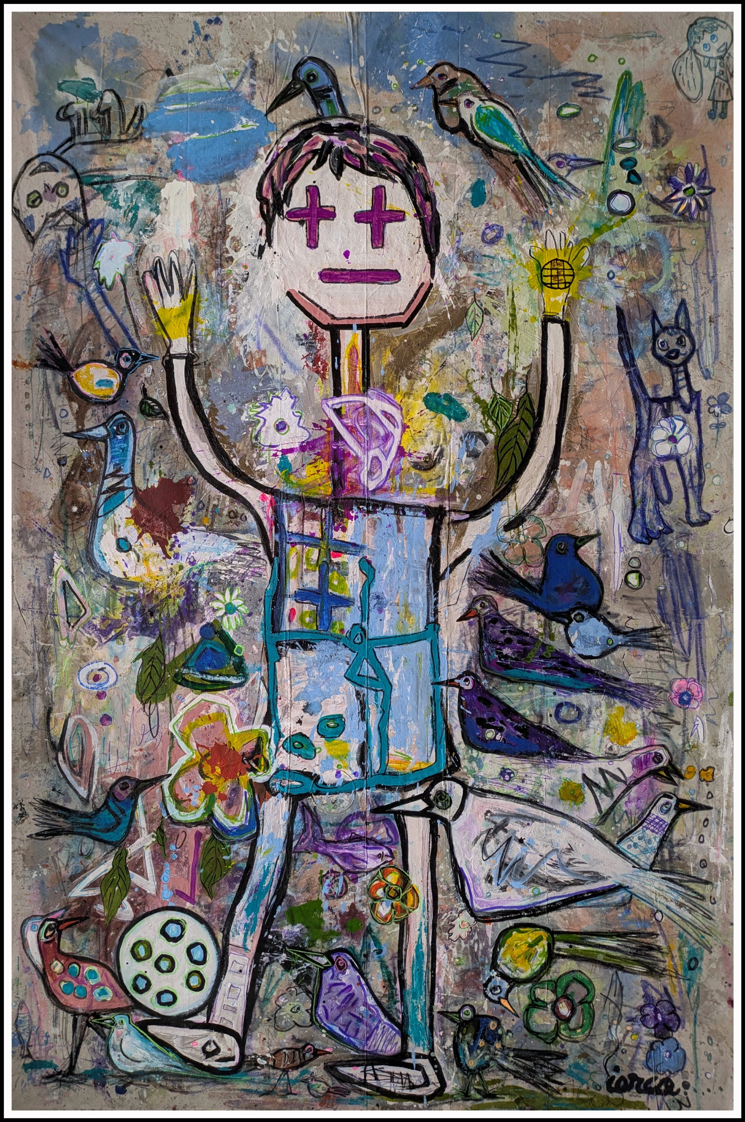 Mixed Emotions - Acrylic, charcoal, markers on canvas, 101” x 66” framed, by Costel Iarca