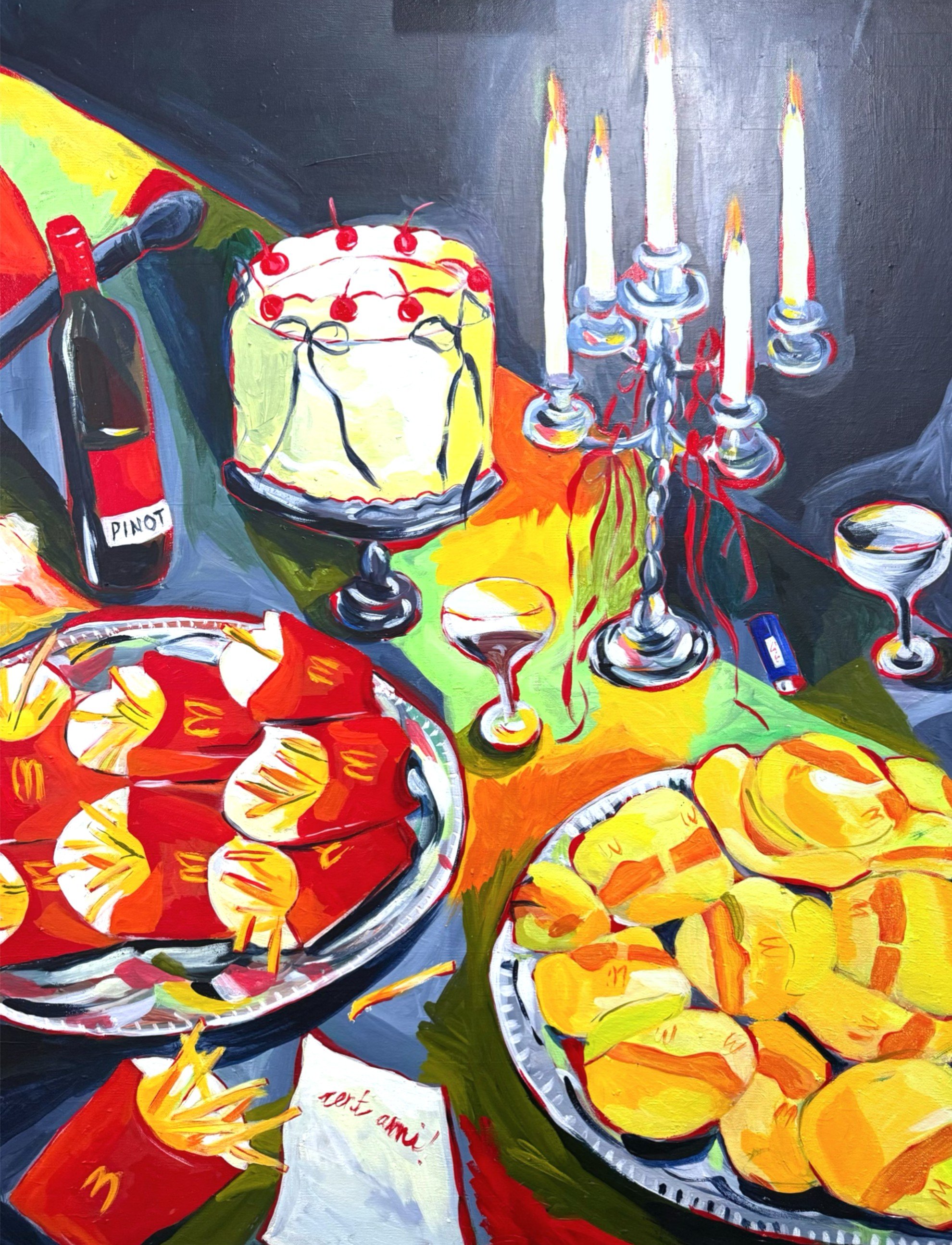 Drawing on her background in theatre, Schnell approaches the canvas like a stage - arranging color, objects, and perspective into intimate scenes of shared meals, celebration, and quiet aftermath. Her paintings originate from photographs that she collects and takes herself, with the aim of capturing and distilling the emotional residue of a gathering: half-finished drinks, scattered fruit, flickering candles, handwritten notes. Through bold color and playful composition, she transforms everyday rituals into vivid reflections on connection and the small moments that shape our inner lives.