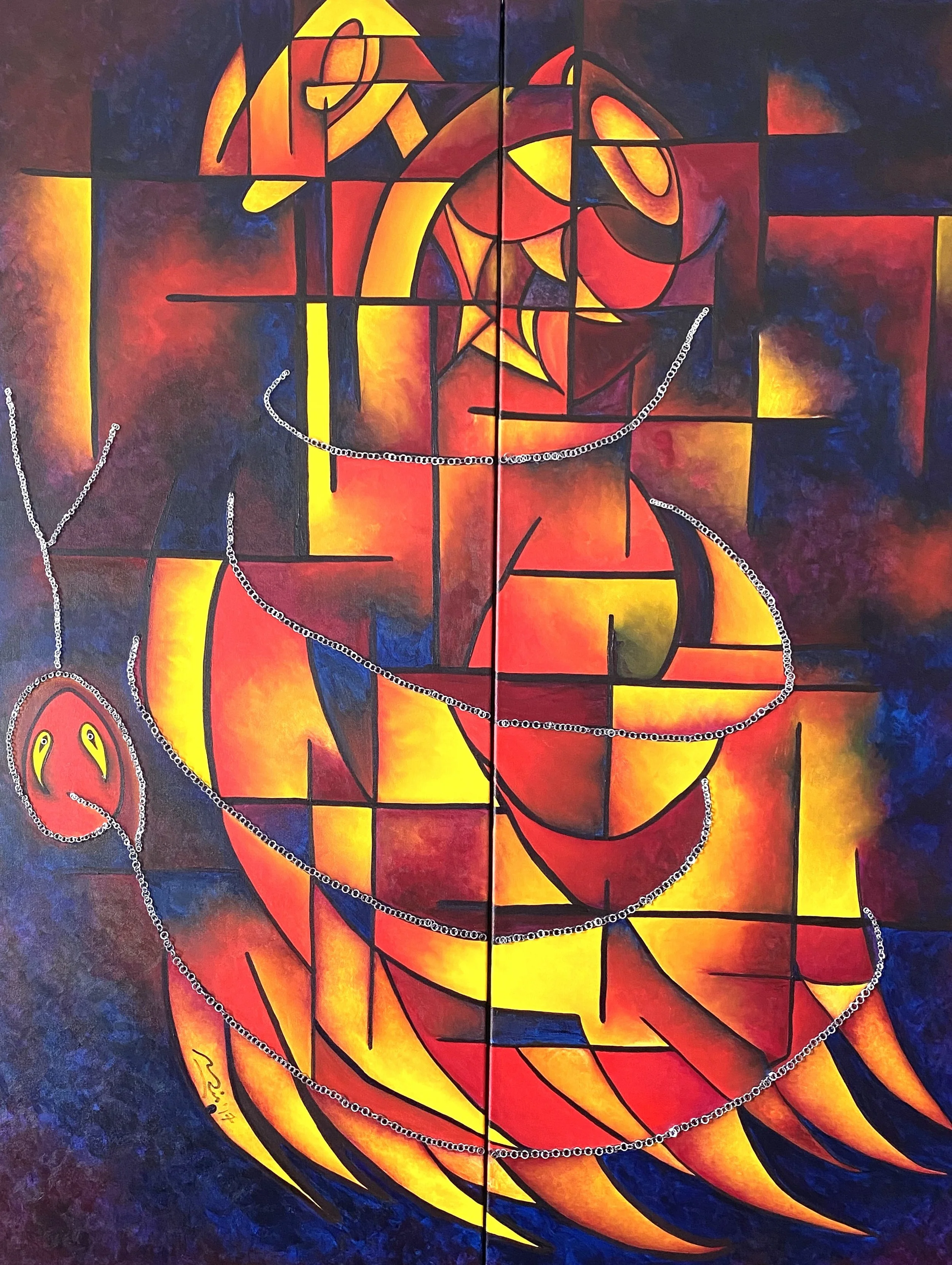 Chained Soul - Acrylic Paint on Canvas with Aluminum Chain, 60” x 48”, by Mais Al-Sheikhly